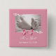 Un élégant c'est un bouton de faire-part de naissance de fille avec une photographie des pieds nouveau-nés de bébé portant toujours ses bandes d'hôpital, encadrés sur un fond rose féminin et embellis avec le feuille en filigrane et un ruban rose girly attaché dans un arc. Cette goupille classique fait partie d'un ensemble de baby shower de fille. Image imprimée d'appartement, ruban non réel.