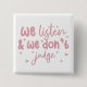 Description : Un message chaleureux et positif écrit dans une police rose, manuscrite et ludique, avec de petits étincelles autour. L'expression "Nous écoutons et nous ne jugeons pas" promeut la gentillesse, la compréhension et une attitude sans jugement.