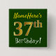 Ce simple design de bouton carré comporte un message comme "NameHere’s 37th Birthday!", avec le "37th" avec un faux/imitation de couleur dorée, sur un arrière - plan de couleur verte. Le nom peut être personnalisé. Des boutons comme ceux-ci pourraient être portés par les invités à une fête d'anniversaire pour quelqu'un qui célèbre son trente-septième anniversaire, où la fête se déroule dans un grand espace avec beaucoup d'autres personnes présentes (comme un parc municipal ou un parc à thème). [~Z0000163]