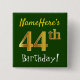 Ce simple design de bouton carré comporte un message comme "NomVoici le 44e anniversaire!", avec le "44e" ayant un faux/imitation de couleur dorée, sur un arrière - plan de couleur verte. Le nom peut être personnalisé. Des boutons comme ceux-ci pourraient être portés par les invités à une fête d'anniversaire pour quelqu'un qui célèbre son quarante-quatrième anniversaire, où la fête se déroule dans un grand espace avec beaucoup d'autres personnes présentes (comme un parc municipal ou un parc à thème). [~Z0000163]