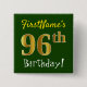 Ce simple design de bouton carré comporte un message comme "96e anniversaire de FirstName!", avec le "96e" avec un faux/imitation de couleur dorée, sur un arrière - plan de couleur verte. Le nom peut être personnalisé. Des boutons comme ceux-ci pourraient être portés par les invités à une fête d'anniversaire pour quelqu'un qui célèbre son quatre-vingt-seizième anniversaire, où la fête a lieu dans un grand quartier avec beaucoup d'autres personnes présentes (comme un parc municipal ou un parc à thème). [~Z0000163]