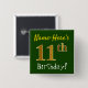 Ce simple design de bouton carré comporte un message comme "Nom-Voici le 11e anniversaire!", avec le "11e" ayant un faux/imitation de couleur dorée, sur un arrière - plan de couleur verte. Le nom peut être customisé. Des boutons comme ceux-ci pourraient être portés par les invités à une fête d'anniversaire pour quelqu'un qui célèbre son onzième anniversaire, où la fête se déroule dans un grand espace avec beaucoup d'autres personnes présentes (comme un parc municipal ou un parc à thème). [~Z0000163]