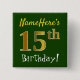 Ce simple design de bouton carré comporte un message comme "NameHere’s 15th Birthday!", avec le "15th" ayant un faux/imitation de couleur dorée, sur un arrière - plan de couleur verte. Le nom peut être personnalisé. Des boutons comme ceux-ci pourraient être portés par les invités à une fête d'anniversaire pour quelqu'un qui célèbre son quinzième anniversaire, où la fête se déroule dans un grand quartier avec beaucoup d'autres personnes présentes (comme un parc municipal ou un parc à thème). [~Z0000163]