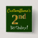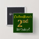 Ce simple design de bouton carré comporte un message comme "2e anniversaire de CustomName !", avec le "2e" à l’allure fausse/imitation dorée, sur un arrière - plan de couleur verte. Le nom peut être personnalisé. Des boutons comme ceux-ci pourraient être portés par les invités à une fête d'anniversaire pour quelqu'un qui célèbre son deuxième anniversaire, où la fête se déroule dans un grand quartier avec beaucoup d'autres personnes présentes (comme un parc municipal ou un parc à thème). [~Z0000163]