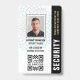 badge d'identification de sécurité personnalisée avec un design géométrique moderne. Ce modèle modifiable comprend votre photo d'identité, votre nom, votre numéro d'employé, le titre de l'emploi, le nom de l'entreprise, le logo, la date d'expiration, ainsi qu'un code QR ou un code à barres. Idéal pour divers lieux de travail et professions tels que gardien de sécurité privé, agent de protection rapprochée, sécurité des magasins, garde du corps personnel, portier officiel, commerçant, laissez-passer pour le personnel médical, etc. Couleurs imprimées : bleu, or, noir et blanc. Magasinez la collection pour plus d'insignes et étiquettes à vendre en ligne, conçu pour l'industrie des services de sécurité.