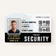 badge d'identification de sécurité privée personnalisé avec un design géométrique moderne. Ce modèle modifiable comprend votre photo d'identité, votre nom, votre numéro d'employé, le titre de l'emploi, le nom de l'entreprise, la date d'expiration, le logo et un code QR ou un code à barres. Idéal pour divers lieux de travail et rôles tels que gardien de sécurité privé, agent de protection rapprochée, sécurité des magasins, garde du corps personnel, portier officiel, commerçant, laissez-passer du personnel médical, et plus encore. Couleurs imprimées : bleu, or, noir et blanc. Magasinez la collection pour plus d'insignes et étiquettes à vendre en ligne, conçu pour l'industrie des services de sécurité.