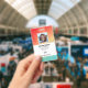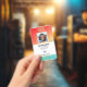 Badge d'identification d'entreprise avec modèles créés pour vous. Le fond est un moderne abstrait dans un dégradé de couleur orange, jaune et vert.