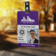 Carte d'identité employé verticale avec une couleur d'accent violet. Ajoutez une photo, 2 logos, nom, titre, numéro d'identification et plus encore pour une carte d'identité professionnelle. Un badge d'employé pratique et professionnel personnalisé avec photo, un logo plus grand et un logo plus petit, ainsi que le titre, le nom de l'entreprise et le nom.