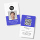 Ce badge d'identification d'entreprise professionnel attrayant comporte la photo de l'employé, son nom et son titre sur le devant, ainsi que le logo de votre entreprise. Le dos du badge comporte un modèle pour le code QR du site Web de votre entreprise et des informations supplémentaires sur l'entreprise, si vous le souhaitez. Tout le texte peut être modifié selon vos préférences. Le design bleu et blanc populaire a un attrait visuel avec une apparence professionnelle.