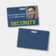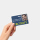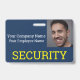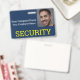 Ce badge d'identification personnalisé comporte un titre "SÉCURITÉ" imprimé en jaune sur la partie inférieure sur fond bleu. Un exemple de photo de garde de sécurité est placé à droite, que vous pouvez personnaliser pour inclure votre propre photo d'identité. Le nom de l'entreprise et le nom de l'employé sont imprimés à gauche de l'image.