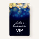 Un design élégant de lumières bleues, marines, dorées, cette invitation à la fête d'anniversaire de Quinceañera et la carte VIP est imprimée sur un badge en plastique unique - commande avec ou sans cordon. CORRESPONDRE des articles dans notre magasin.