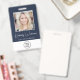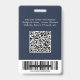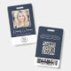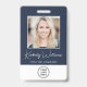 Badge d'identification d'employé bleu foncé moderne et professionnel comportant leur photo, leur nom dans un script blanc stylisé et leur titre en lettrage blanc simple, ainsi que le logo de votre entreprise. Au dos, ajoutez toute information supplémentaire et des codes QR et code-barres facultatifs.