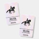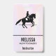 Badge avec une illustration en noir et blanc d'un cavalier de dressage. Le cheval et le cavalier exécutent une pirouette. Classique et beau. Sur un fond d'aquarelle dans des couleurs pastel délicates et atténuées.