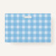 Ce nom ou badge d'identification est bleu et blanc plaid avec trois chatons mignons portant des arcs roses assis avec leur chatte mère blanche souriante. Customisez votre nom et vos informations aux modèles.