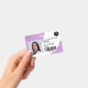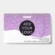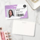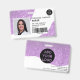 Un badge d'identification photo d'infirmière à paillettes violettes moderne et professionnel avec logo et code-barres en disposition horizontale.