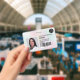 Un badge d'identification photo moderne et professionnel, holographique et irisée pastel nacre nacre, avec logo et code-barres, disposition horizontale.