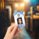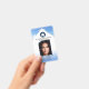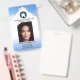 badge professionnel d'identification photo avec votre photo personnalisée et logo sur un élégant design bleu blanc avec quelques nuages moelleux. À l'arrière, vous pouvez ajouter un code à barres personnalisé ou un code QR et des textes supplémentaires (ou supprimer les modèles).