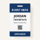 Practical no nonsense ID d'événement badge personnalisé avec nom, société, rôle, et code QR en bleu foncé.