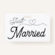 Just Married—amusant badge de mariée pour mariée et mariée. Police de script élégante avec une jolie illustration cardiaque. Lettres noires simples et sucrées.