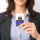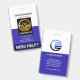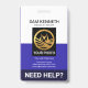 Un design simple avec des colonnes blanches et bleues. En haut se trouve votre nom prestigieux et votre numéro d'identification. En dessous, une option de photo est disponible à côté de votre titre professionnel. Les dimensions de la photo sont de 1 000 x 1 200 pixels. Viennent ensuite les coordonnées avec une option de slogan "Besoin d'aide ?" près de la base pour faire ressortir ce badge. Modifiez les remarques du slogan pour l'adapter à vos besoins.