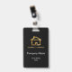 Des badges de nom d'employé de l'immobilier ou de représentant de terrain de classe avec un clip inclus dans une conception élégante qui comprend un symbole de maison de couleur or et une ligne de séparation géométrique qui a une apparence métallique avec des modèles de nom et de nom d'entreprise que vous pouvez personnaliser en ligne. Conçu pour un agent immobilier, un courtier, un agent ou une agence. Parfait à porter lors d'une maison ouverte pour une apparence professionnelle.