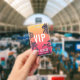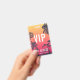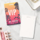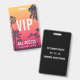 Parfait pour les concerts d'été, les festivals et les grands événements, ce badge personnalisable présente un fond de silhouettes de palmiers sur un coucher de soleil estival rouge et jaune, avec des textes superposés en blanc. Personnalisez pour les VIP, le personnel, la presse ou d'autres utilisations, avec trois lignes de texte sur le devant. Ajoutez des informations supplémentaires sur l'événement au dos du badge en lettrage blanc sur fond noir.