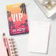 Idéal pour les concerts d'été, les festivals et les grands événements, ce badge personnalisable présente un arrière - plan de silhouettes de palmiers contre un coucher de soleil d'été rouge et jaune, avec des superpositions de texte blanc. Personnaliser pour les VIP, le personnel, la presse ou d'autres usages, avec trois lignes de texte à l'avant. Ajoutez des informations supplémentaires sur l'événement à l'arrière du badge en lettres blanches sur le noir.