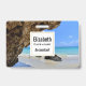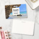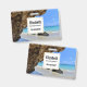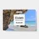 Étiquette avec une photographie de paysage naturel. Belle mer bleu turquoise avec une plage de sable. Un gros rocher brun fournit de l'ombre sous le ciel bleu brillant.