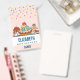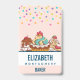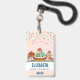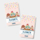 Nommez le badge avec une rangée de succulents cupcakes à l'air avec des tourbillons et des cerises et le givrage délicieux. Illustré dans un style rétro classique. Les couleurs sont vert rétro, rouge, bleu et crème. Image colorée de confettis parsemée en haut.