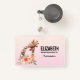 Nom badge avec un dessin mignon en aquarelles d'une maman et de la petite girafe. La girafe mère se repose la tête au-dessus de la petite girafe, aimante et adorable. Joli bouquet de fleurs d'aquarelle rose, jaune, vert placé sous cette paire de chatons. Un arrière - plan dégradé créé avec une couleur rose douce qui se fond dans une couleur orange clair et achalandée.