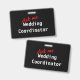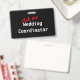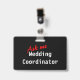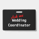 Ce badge noir indique "Demandez-moi" en écriture rouge. Vous pouvez également personnaliser le badge avec votre titre tel que "Coordinateur de mariage".