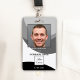 Badge d'identité photo avec un design noir et blanc avec un espace pour votre photo et logo personnalisés. Au dos, vous pouvez ajouter un code-barres ou un code QR personnalisé et des textes supplémentaires ou supprimer les modèles. Vous pouvez également copier et coller le design et les photos de l'avant vers l'arrière si vous le souhaitez.