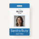 badge vertical bleu personnalisé avec photo et nom de l'employé. Personnalisez-le avec un numéro d'identification d'employé, un rôle, un titre, un emplacement ou d'autres détails importants. Ajoutez le logo de votre entreprise en haut pour une touche professionnelle. L'arrière du badge comporte un champ de texte personnalisé pour les informations de retour ou d'autres détails clés. Cette conception facilite la personnalisation, en garantissant que chaque badge est unique et répond parfaitement aux besoins de votre entreprise.