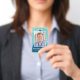 Carte d'identification personnalisable bleu et blanc pour les employés. Le badge d'identification professionnel peut être entièrement personnalisé, y compris la photo, le nom, le titre de poste sur le devant ainsi que tout le texte au dos.