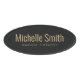 Des étiquettes de nom personnalisées avec votre nom et votre titre imprimés sur un arrière - plan gris foncé.