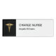 Les étiquettes chiques de nom de soins de santé d'infirmier en chef conçoivent dans un style amical de budget avec le symbole médical de caducée coloré par or et l'espace de nom pour vos employés à un hôpital, à une clinique médicale, ou à un dispensaire.