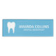Un dentiste ou un assistant dentaire professionnel personnalisé portant le logo d'une dent blanche. La couleur arrière - plan est par défaut bleue mais peut être changée en n'importe quelle couleur. Changez la police, le texte (nom, nom de famille, titre du poste, nom de la clinique, etc.) ou le logo. Facile à customiser modèle idéal pour un dentiste, assistant dentaire, hygiéniste de la bouche ou d'autres employés.