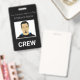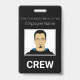 Ce badge d'identification photo personnalisé comporte une photographie échantillon au centre. Le titre "ÉQUIPAGE" est imprimé en dessous en caractères blancs gras sur fond noir pour signifier que l'individu est membre d'équipage pour votre événement. Vous pouvez inclure le nom de votre entreprise ou un texte supplémentaire au-dessus de l'image, ainsi qu'un nom d'employé. Le verso du badge comporte des informations supplémentaires sur l'employé ou l'entreprise imprimées sur fond noir, avec un code-barres échantillon placé en bas. Vous pouvez remplacer le code de numérisation par le vôtre, ou une autre image, telle qu'un logo personnalisé.
