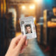 Badge d'identification avec photo et logo personnalisés sur un design élégant de brique en marbre. Au verso, vous pouvez ajouter un code-barres ou un code QR personnalisé ainsi que des textes supplémentaires (ou supprimer les modèles). Conçu pour une agence immobilière et personnalisable pour d'autres professionnels.