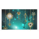 Or, clés antiques avec engrenages et cadrans accrochés sur chaînes dorées sur arrière - plan vert lumineux.
