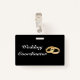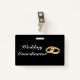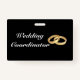 Deux anneaux de mariage or apparaissent sur cet insigne de coordinateur mariage. Ce badge noir peut être personnalisé avec votre titre comme "Coordinateur Mariage".