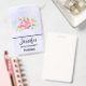 Nom badge avec une belle et élégante aquarelle créé bouquet floral. Fleurs de jardin roses entourées de feuillage vert clair. Arrière - plan d'aquarelle violette.