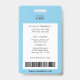Cet élégant badge d'identification d'hôpital bleu ciel est parfait pour les médecins, les infirmières et d'autres fournisseurs de soins de santé dans les cliniques et les centres médicaux. Doté d'un design vertical, il comprend une grande photo, un nom, un titre d'emploi et un département dans un format propre et moderne. Le dos contient les coordonnées d'urgence, un code à barres pour une numérisation facile et un site Web. Conçu pour la lisibilité et la sécurité, ce badge convient aux environnements rapides comme les salles d'urgence et les établissements de soins aux aînés. Ses tons bleu clair et son agencement professionnel en font un choix exceptionnel pour le personnel hospitalier.