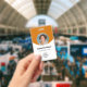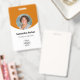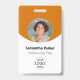 Personnalisez ces badges employés orange verticaux avec une photo d'employé, un logo d'entreprise, un code-barres, un identifiant d'employé et un nom.