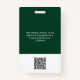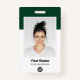 Personnalisez facilement ce badge personnalisé de nom d'employé avec Photo, Scan Qr Bar Code et logo d'entreprise. Un design d'affaires simple dans des couleurs élégantes, vert foncé et blanc entièrement personnalisable en tailles avant et arrière, sans-serif polices de base et moderne et un look professionnel et clair. Disponible avec cordon, clip métallique ou avec rétractable. Pas de commande minimum.