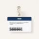 Personnalisez facilement ce badge personnalisé de nom d'employé avec photo, code de la barre d'analyse et logo de l'entreprise, avec clip métallique inclus. Un design d'entreprise simple aligné à gauche dans des couleurs bleu marine et blanc entièrement personnalisable en tailles avant et arrière, sans-serif polices de base et moderne et un look professionnel et clair. Disponible avec ou sans nacelle, clip métallique ou avec rétractable. Pas de commande minimum.