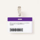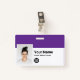 Personnalisez facilement ce badge personnalisé de nom d'employé avec photo, code de la barre d'analyse et logo de l'entreprise, avec clip métallique inclus. Un design d'entreprise simple aligné à gauche dans des couleurs violettes et blanches profondes entièrement personnalisable en tailles avant et arrière, sans-serif polices de base et moderne et un look professionnel et clair. Disponible avec ou sans nacelle, clip métallique ou avec rétractable. Pas de commande minimum.