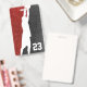 La fausse parties scintillant rouge rubis et noire scintille derrière un contour blanc audacieux d'un joueur de basket. Mettez facilement à jour le numéro de maillot sur le devant et personnalisez les informations sur le dos. Disponible dans d'autres couleurs brillantes d'équipe.