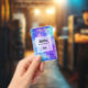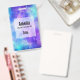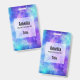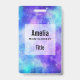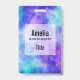 Nom badge avec un arrière - plan abstrait cosmique. Couleurs vives et éclatantes de bleu clair, rose et violet. Des étoiles blanches éparpillées un peu partout.
