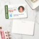 Un cadre photo circulaire donne une touche de classe à ce badge d'identification photographique. Téléchargez votre propre logo et vos coordonnées et ajoutez plus d'informations au verso. Voyez rapidement le titre du poste du porteur et ses autorisations. Changez les couleurs du rectangle et du cadre photo pour les adapter à votre lieu. Convient à de nombreux titres de poste, du personnel enseignant, bénévole, personnel médical, collecteur de fonds ou agent de sécurité, etc.